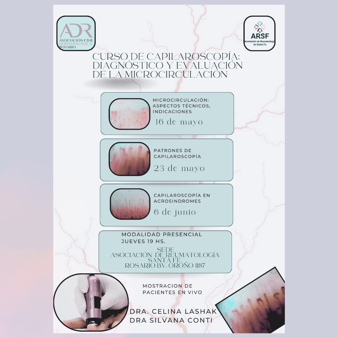 Los días Jueves 16 y 23 de Mayo y 6 de Junio se llevará a cabo el «Curso de Capilaroscopia: diagnóstico y evaluación de la microcirculacion» a cargo de la Asociación de Dermatologia Rosario y la Asociación de Reumatologia de Santa Fe.